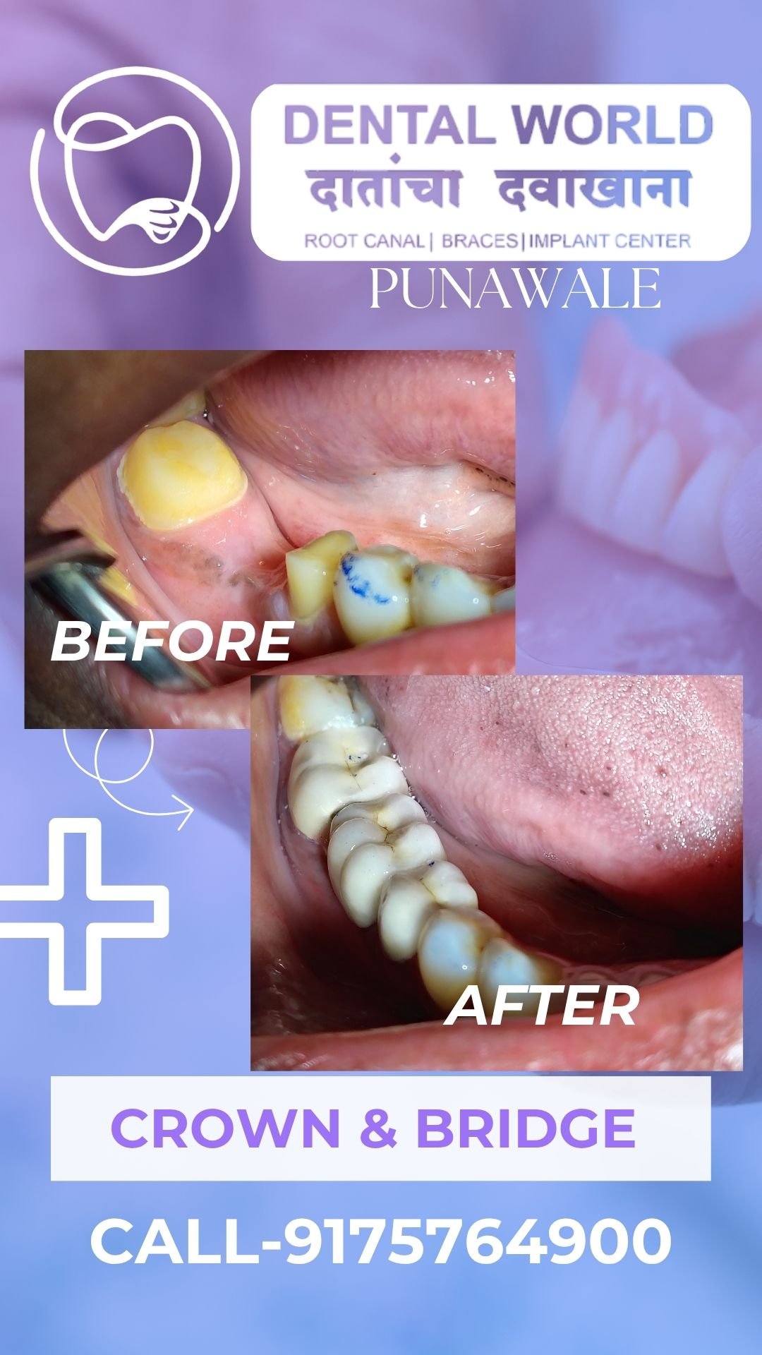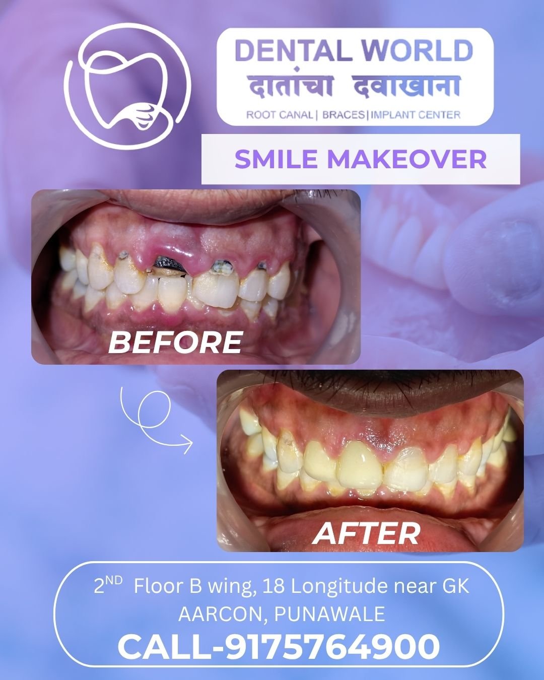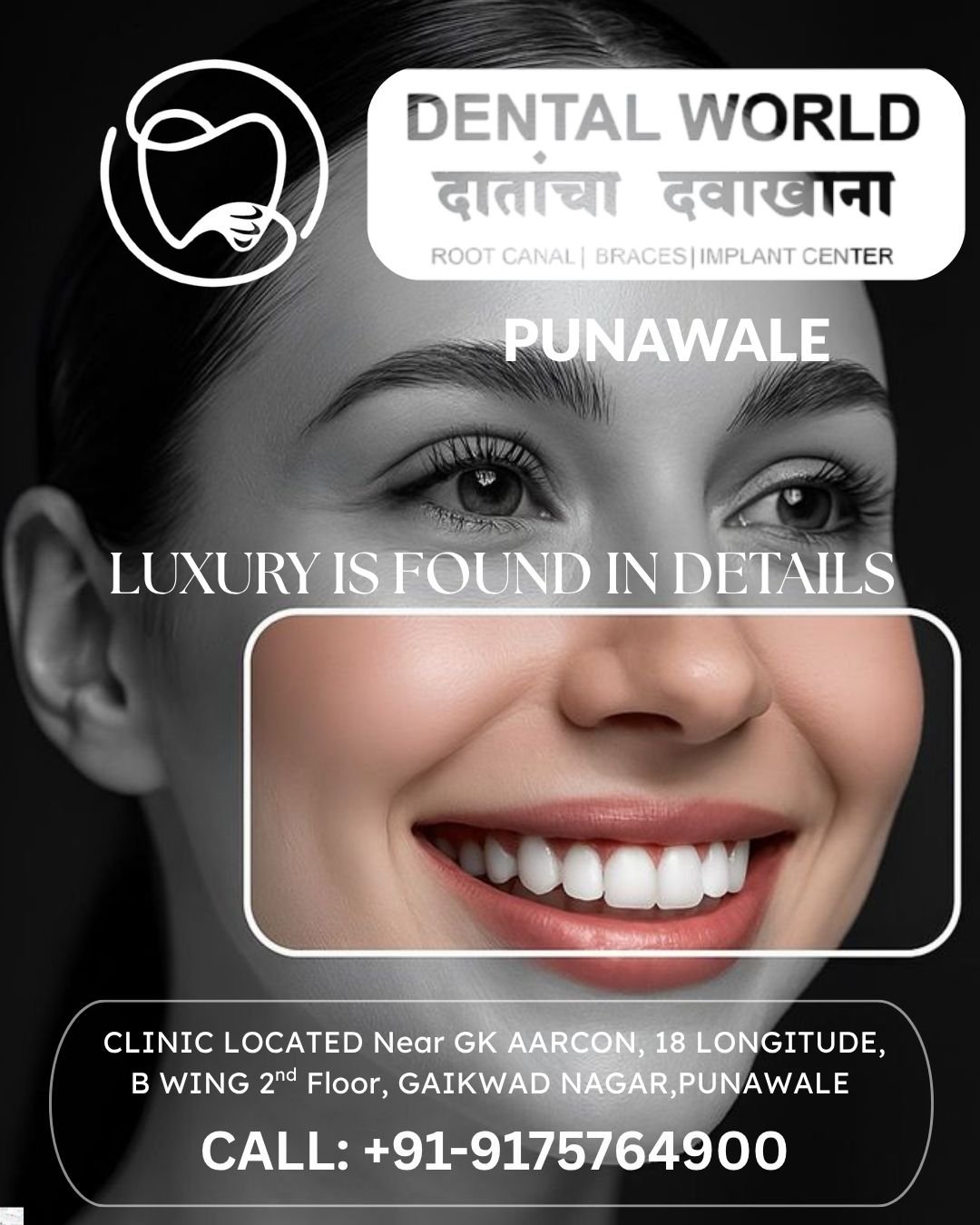 Dental World Dental clinic in Punawale is your trusted destination for painless, advanced, and premium affordable dental care. Led by Dr. Utkarsh Chavan & team of dentists, we specialize in Root canals treatment, braces, clear aligners, dental implants, smile makeovers, and preventive treatments. Clinic provide panel Of All Specialized MDS doctors for your problems focusing on pain-free treatments with highest patient comfort. Whether you need a painless Root canal in Punawale, teeth whitening near me , or braces in Tathawade, we provide treatment for patients looking for Dentist near me and surrounding areas with care, comfort. Book appointment today with the best dentist in Punawale and experience dental care that puts your smile first.